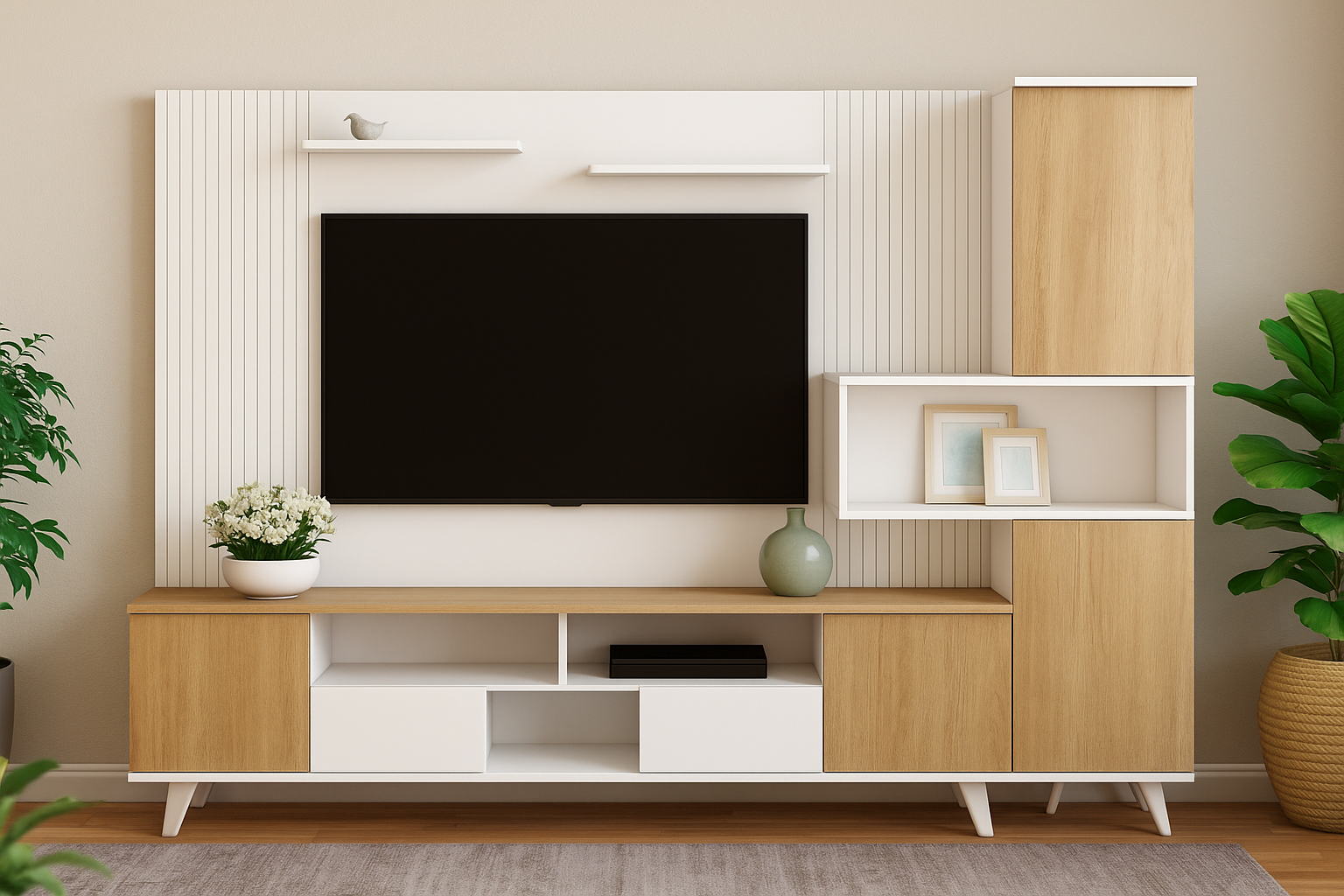 - Amplio espacio de guardado, con una combinación de estantes abiertos y estantes con puertas.